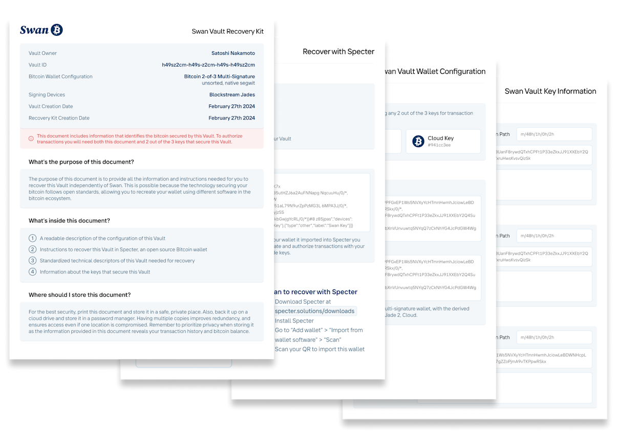 If you lose a key, you can recover your funds. All Swan Vaults can be recovered using widely available open-source Bitcoin wallet software, such as Specter Desktop or Bitcoin Core. When you set up your Vault, you’ll download an easy-to-follow recovery kit with clear instructions. We adopted industry standards to maximize the portability and recoverability of your Vault.