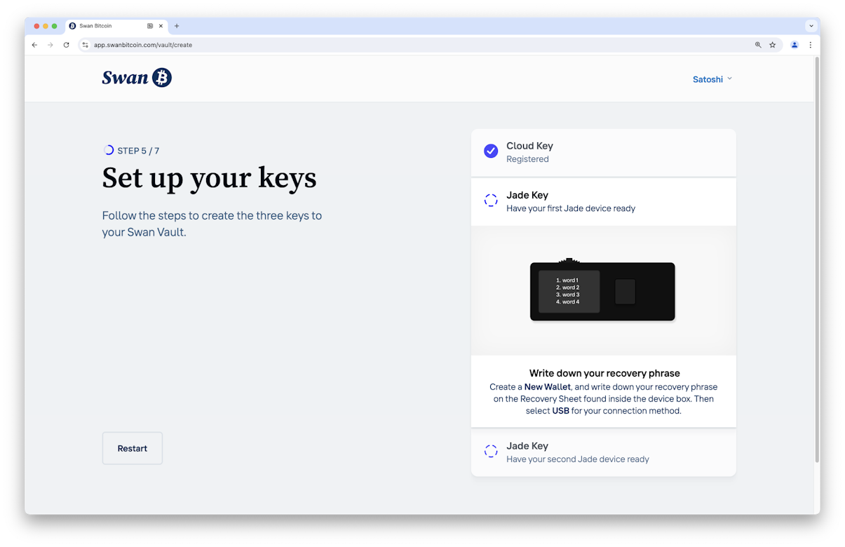 We carefully designed Swan Vault to remove the technical barriers and complexity that often deter people from embracing self-custody. Swan Vault empowers anyone to confidently take custody of their Bitcoin with guided on-screen setup to streamlined deposits and withdrawals. Blockstream Jade signing devices are straightforward and secure, making them the perfect companion to Swan Vault’s human-centered design. This ease of use does not come at the expense of security; instead, it is a harmonious blend of both, ensuring users enjoy peace of mind without navigating a complex technological maze.