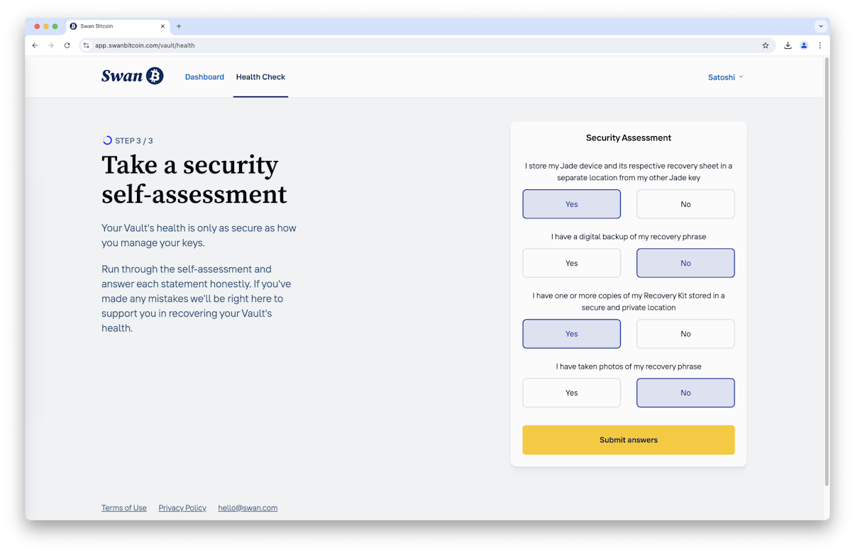 Although you have total control, you don’t have to manage everything alone. Whether you have questions about setting up your Vault, performing transactions, or recovering your funds, Swan’s team of experts stands ready to provide personalized assistance. By combining independent control with a robust safety net and expert guidance if needed, Swan Vault delivers peace of mind to Bitcoiners at all levels.